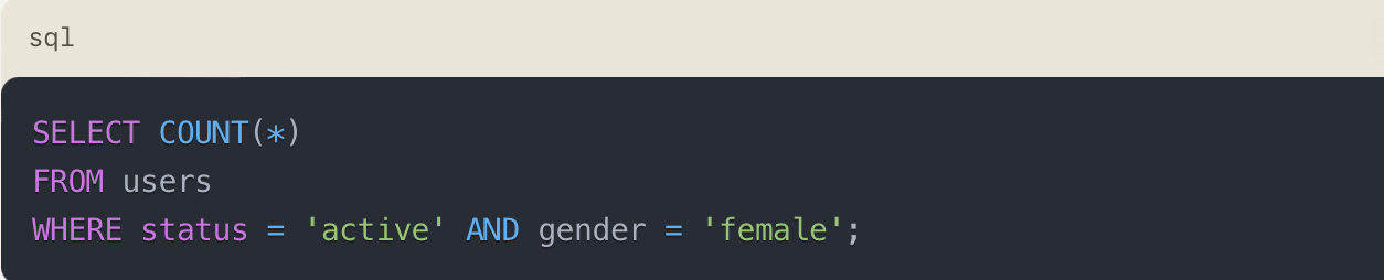 This query can be efficiently executed by performing a bitwise AND operation on the bitmaps for 'active' status and 'female' gender, then counting the resulting 1s.