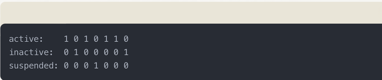 In this representation, each position corresponds to a row in the table. For example, the first user is 'active', the second is 'inactive', and the fourth is 'suspended'.
